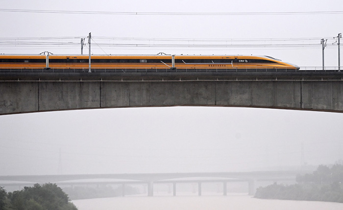 联调联试综合检测列车驶过位于陕西省西安市的西延高铁渭河特大桥。