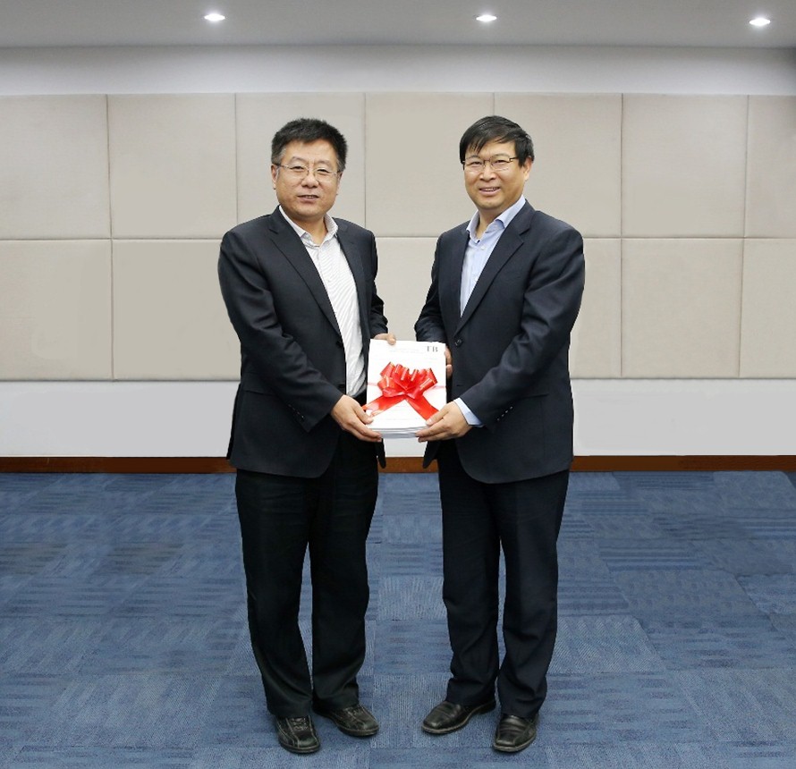 国家铁路局科技与法制司严贺祥司长(右一)向中国交通建设股份有限公司海外事业部陈重总经理(左一)赠送英文版铁路技术标准