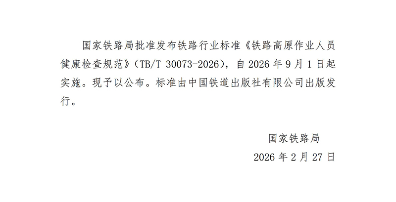 国家铁路局批准发布铁路行业标准《铁路高原作业人员健康检查规范》(TB/T 30073-2026)。