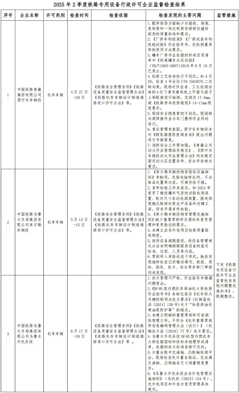 2025年2季度,兰州铁路监督管理局按照铁路专用设备行政许可相关法律法规和文件规定,依据《国家铁路局关于印发<2025年度铁路专用设备行政许可企业监督检查计划>的通知》(国铁设备监函〔2025〕8号),检查铁路专用设备行政许可企业3家,下发《铁路专用设备行政许可企业监督检查发现问题整改通知书》3份。要求受检企业对监督检查发现的问题进行整改,将整改措施和整改情况及时报兰州铁路监督管理局。现将监督检查结果通报如下:
