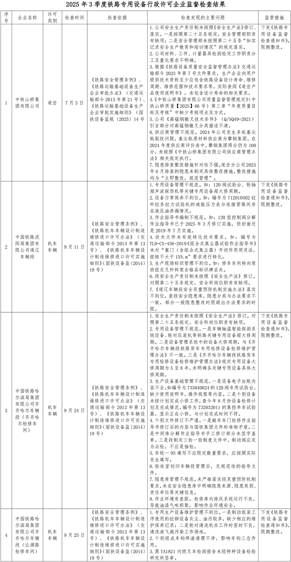 2025年3季度,沈阳铁路监督管理局根据国家铁路局关于印发《2025年度铁路专用设备行政许可企业监督检查计划》的通知(国铁设备监函〔2025〕8号),依法对中铁山桥集团有限公司、中国铁路沈阳局集团有限公司通辽车辆段和中国铁路哈尔滨局集团有限公司齐齐哈尔车辆段(齐齐哈尔检修车间和让湖路检修车间)开展监督检查,共发现问题25项,下发《铁路专用设备监督检查通知书》4份,要求受检企业对监督检查发现的问题进行整改,将整改情况及时报送沈阳铁路监督管理局。现将监督检查结果通报如下:
