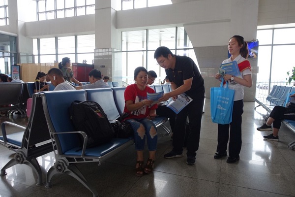 图为呼和浩特东站现场宣传人员观看主题活动展板
