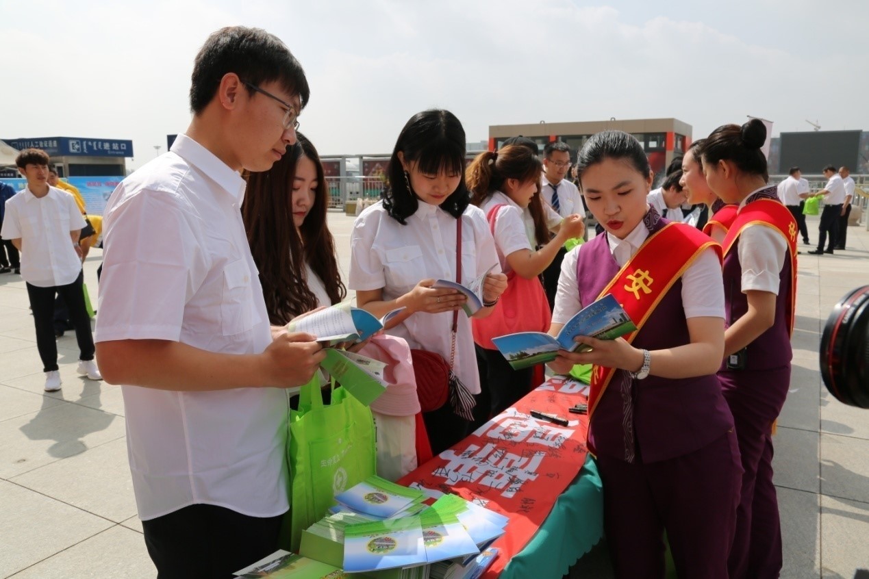 图为呼和浩特东站现场宣传人员观看主题活动展板