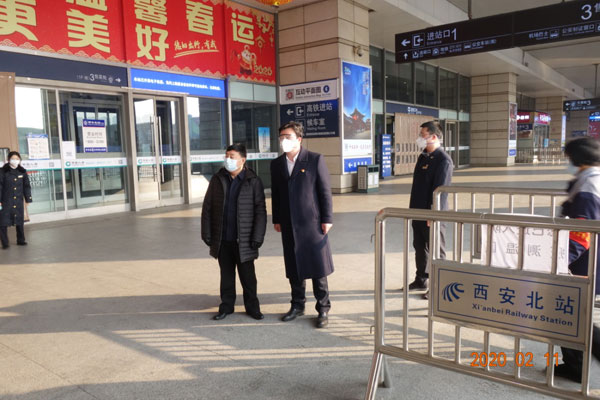 2月11日,局领导深入西安北站开展疫情防控和运输安全监督检查。重点检查了车站旅客运输组织、进出站测温及通风消毒措施落实、配合地方政府联防联控工作开展等情况,向西安客运段人员详细了解了与2月9日确诊高铁保洁员密切接触的铁路工作人员隔离等防护措施采取情况,并对下一步工作提出具体要求。